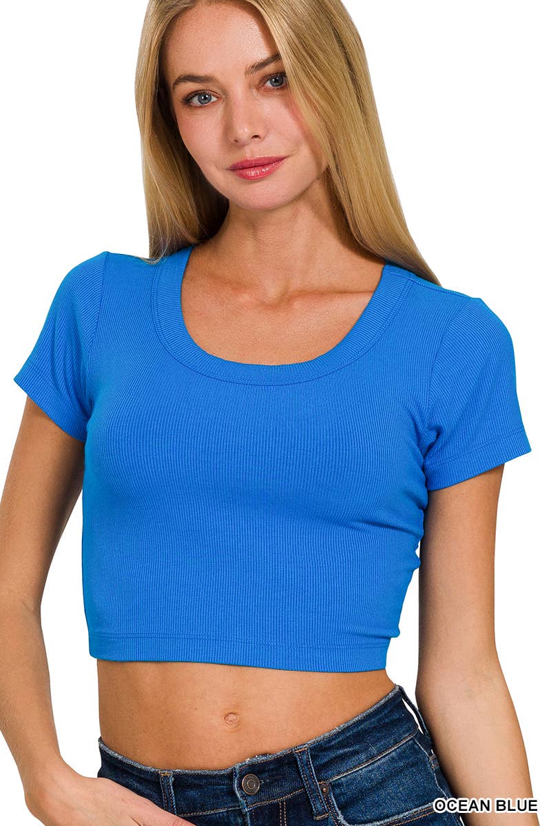 Ribbed Scoop Neck Crop Short Sleeve Top 95% Rayon 5% Spandex
